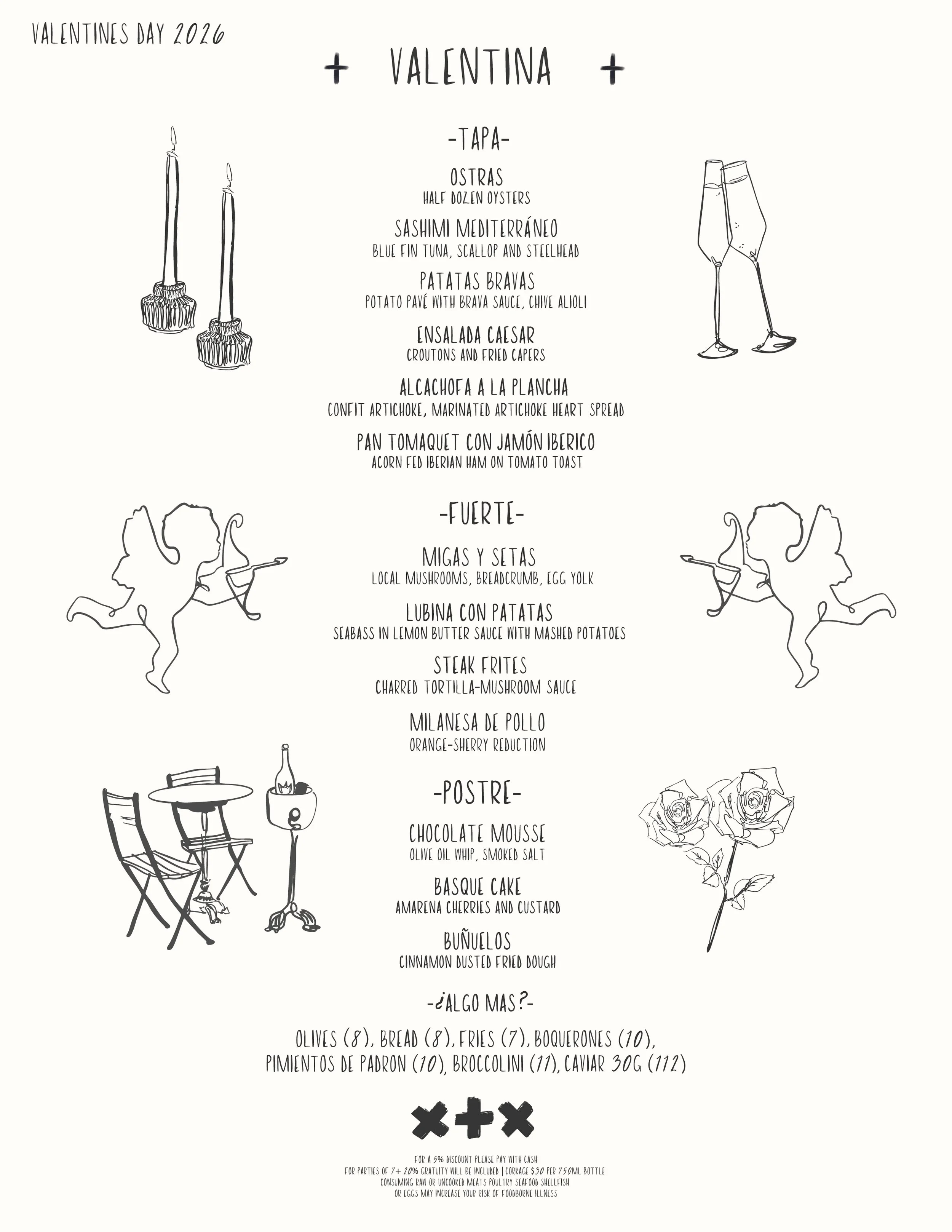 Set the mood with a three course menu featuring Valentina's favorites. Champagne and candlelight anyone?